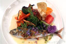 - 器に魚を盛り、添え野菜を飾り、ソースをかけます。
